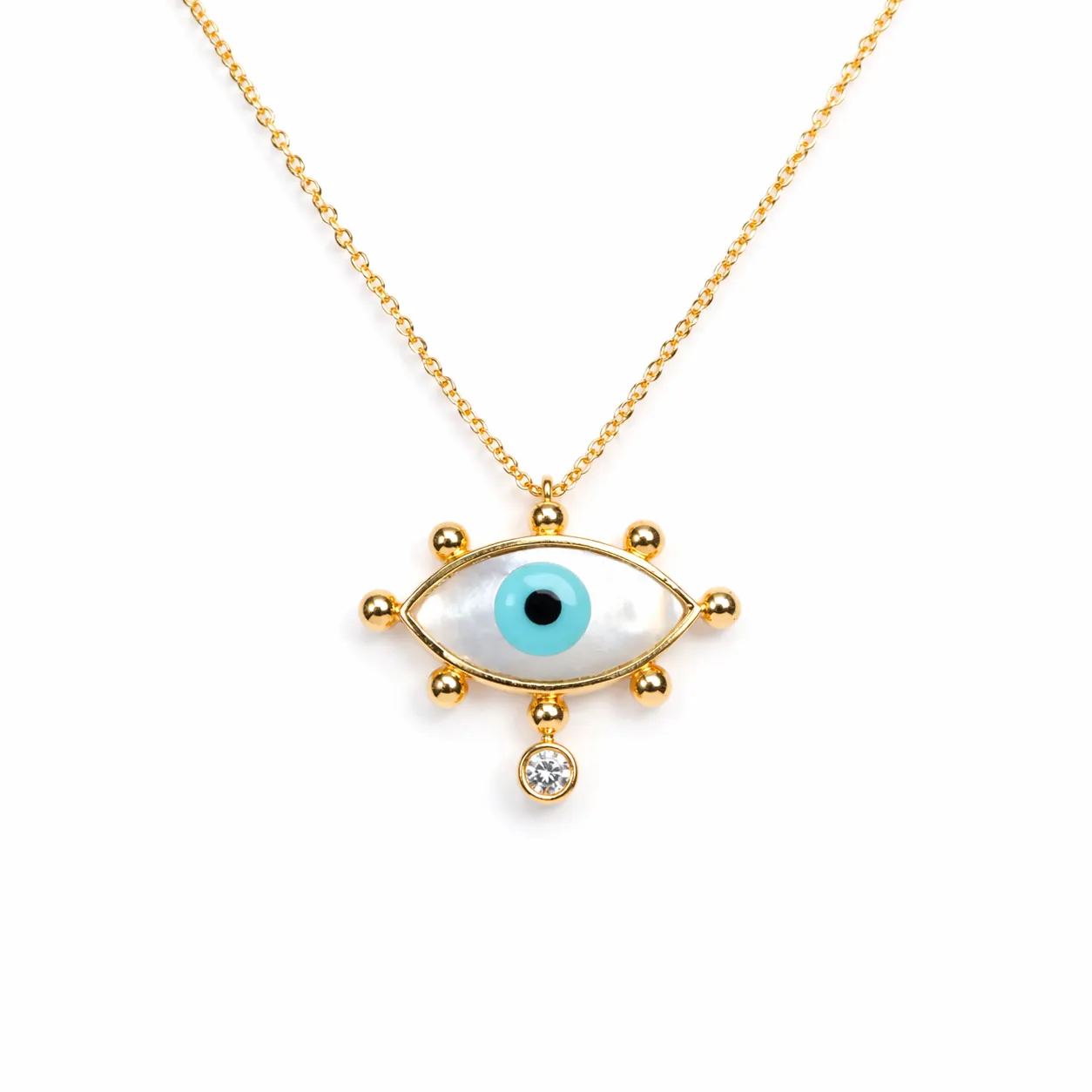 Sedef zemin üzerine nazar göz motifiyle tasarlanan bu altın kolye, zarif ve anlamlı bir mücevherdir. Minimal detayları ve nazar sembolüyle hem şık hem de koruyucu anlam taşıyan özel bir tasarım sunar.