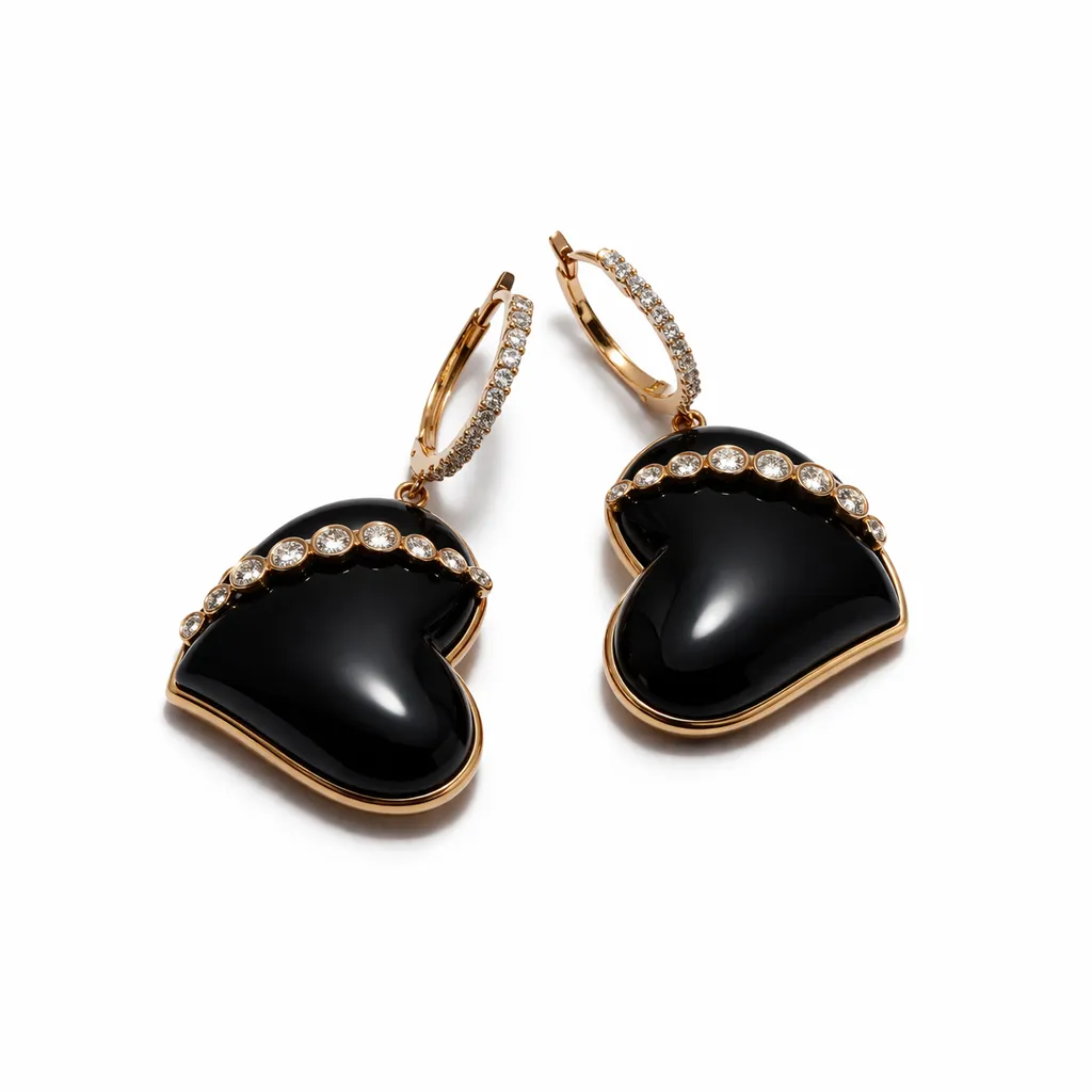 Modern ve güçlü bir tasarım anlayışıyla öne çıkan bu küpe, parlak siyah onyx taşı ile sofistike bir duruş sergiler. Üst bölümde yer alan pırlanta detaylı halka form, tasarıma zarif bir ışıltı katarken; alt kısımdaki organik formda kesilmiş onyx taş, özgün ve dikkat çekici bir görünüm sunar. Günlük şıklığı tamamlamak veya özel anlarda stilinizi vurgulamak için ideal bir parçadır.
