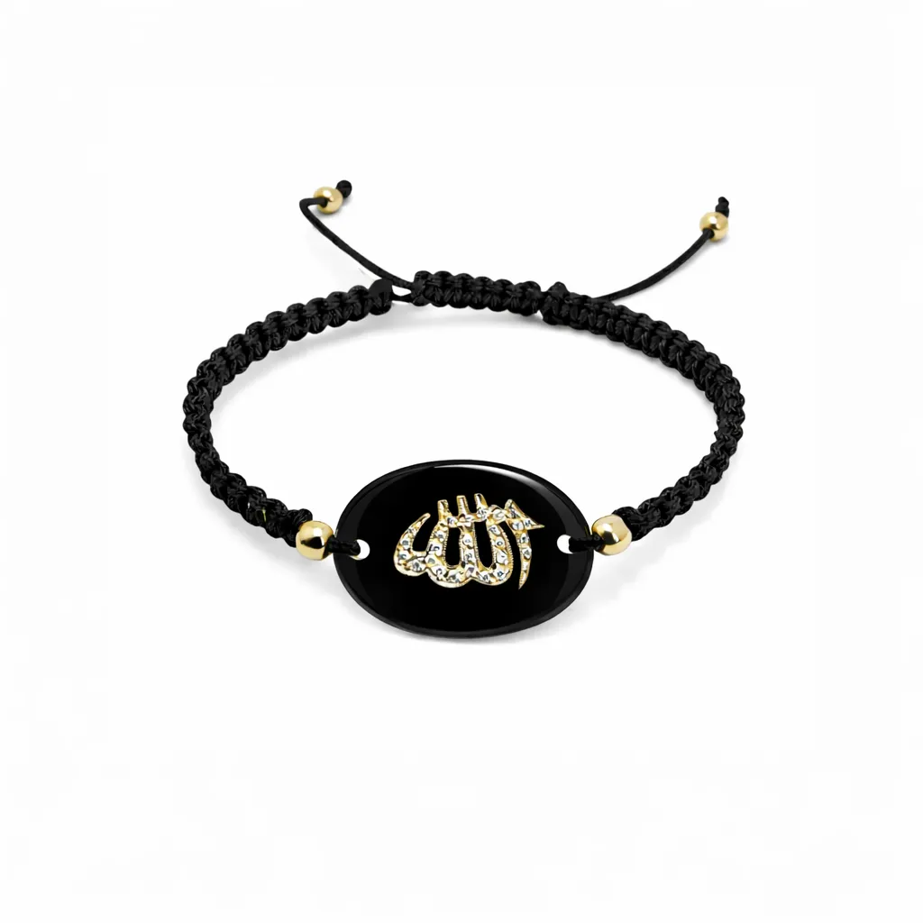 Siyah Onyx üzerine Allah yazılı altın detaylı ayarlanabilir ip bileklik modeli. Şık ve anlamlı tasarımıyla dikkat çeken özel bir dini bileklik.