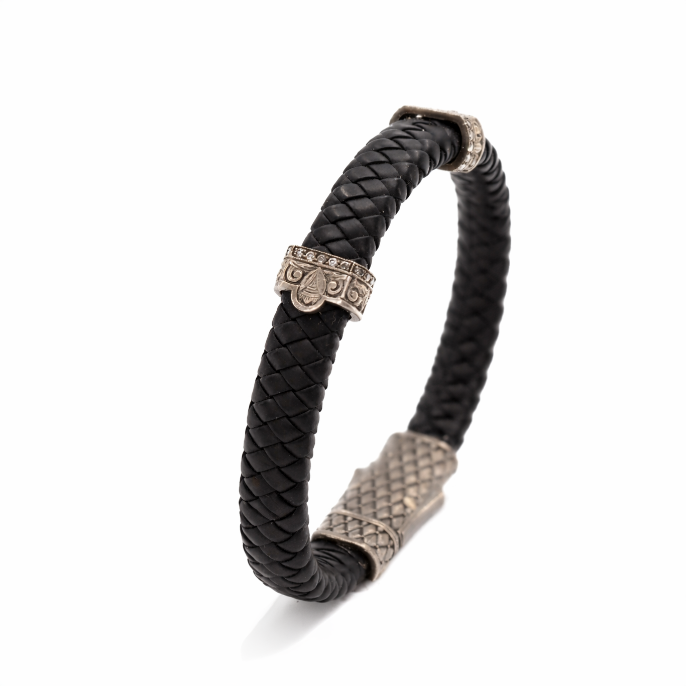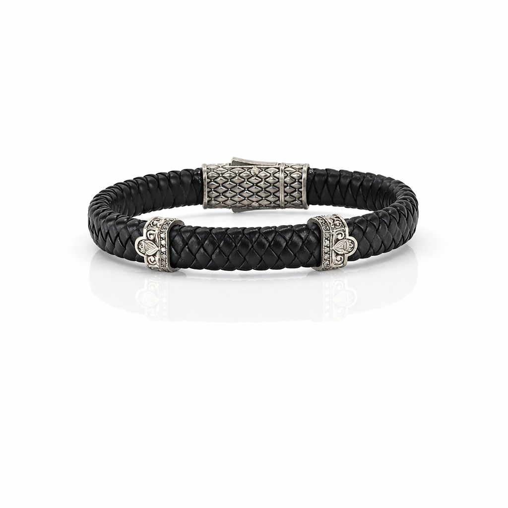 Net ve güçlü görünümüyle öne çıkan bu bileklik, örgü dokulu siyah deri ve işçilikli gümüş detaylarla tamamlanır. Siyahın keskin etkisi, metal yüzeylerdeki detaylarla birleşerek dikkat çeken bir bütün oluşturur.