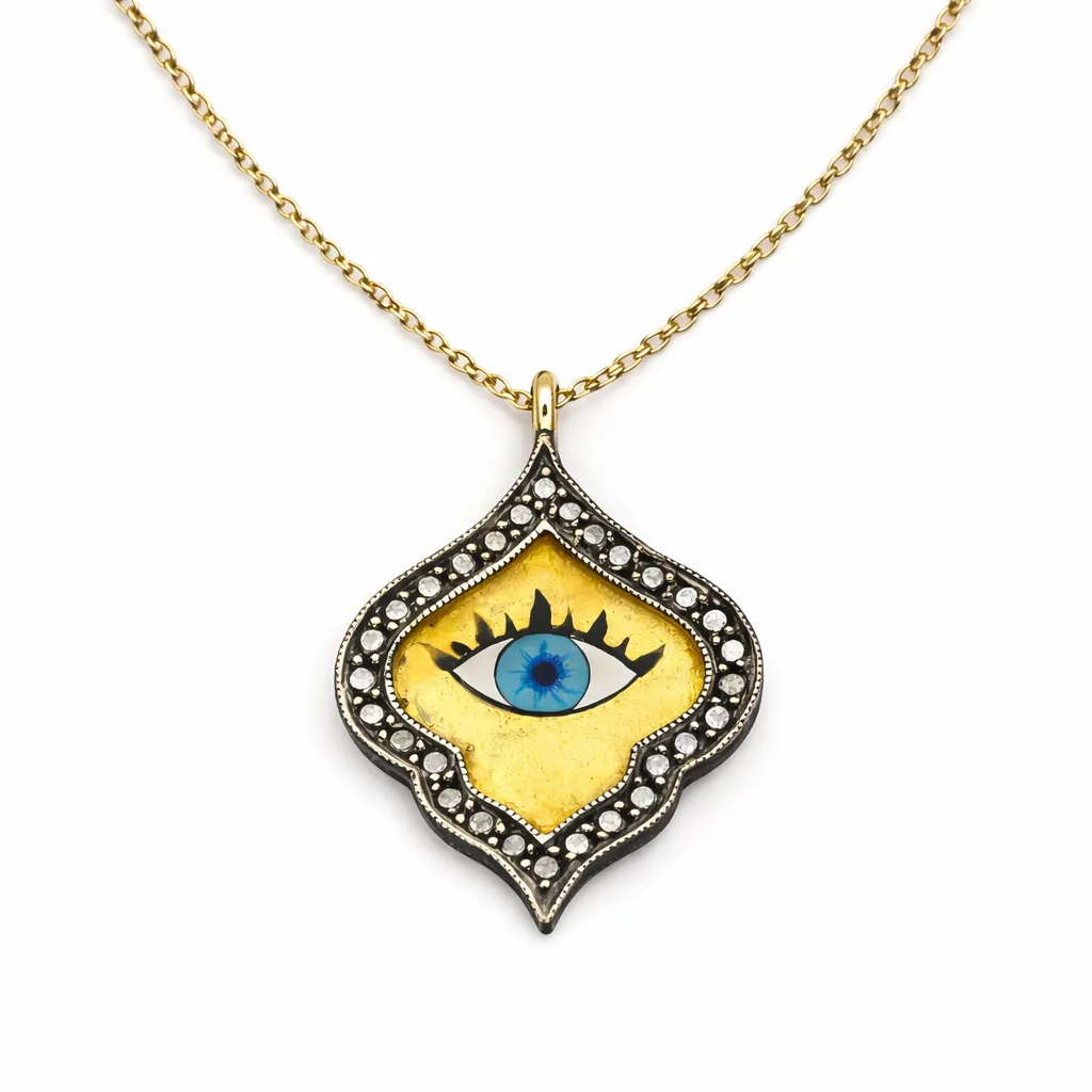Merkezinde yer alan nazar göz motifiyle dikkat çeken bu altın kolye, güçlü bir sembolü modern bir tasarımla buluşturur. Altın zemin üzerinde konumlanan göz detayı, etrafını saran siyah pırlantalar ile derin ve çarpıcı bir görünüm kazanır. Okside çerçeve ile tamamlanan tasarım, parlak altın zincirle kontrast oluşturarak karakterli bir stil sunar. Günlük kullanımda fark yaratan ya da özel kombinlere güçlü bir dokunuş ekleyen etkileyici bir parçadır.