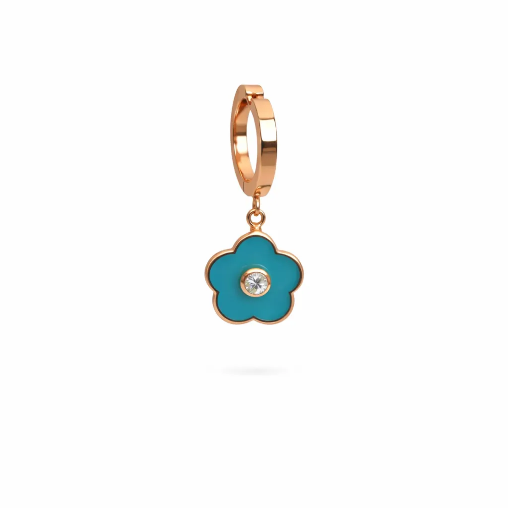 Çiçek formunda turkuaz renk detaylı sallantılı küpe. Ortasında taş detayı bulunan zarif ve modern tasarım.