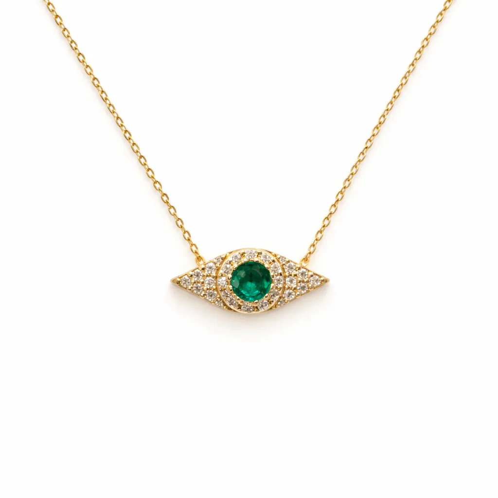 Ortada yer alan canlı yeşil zümrüt taşı, göz formundaki tasarıma güçlü bir odak noktası kazandırır. Etrafını saran pırlanta detaylar ise kolyeye ışıltı ve zarif bir görünüm ekler. İnce altın zinciri ile dengeli bir duruş sunan bu tasarım, hem günlük kullanım hem de özel anlar için uygundur. Göz motifiyle dikkat çeken bu kolye, stiline anlam ve şıklık katmak isteyenler için öne çıkan bir parçadır.
