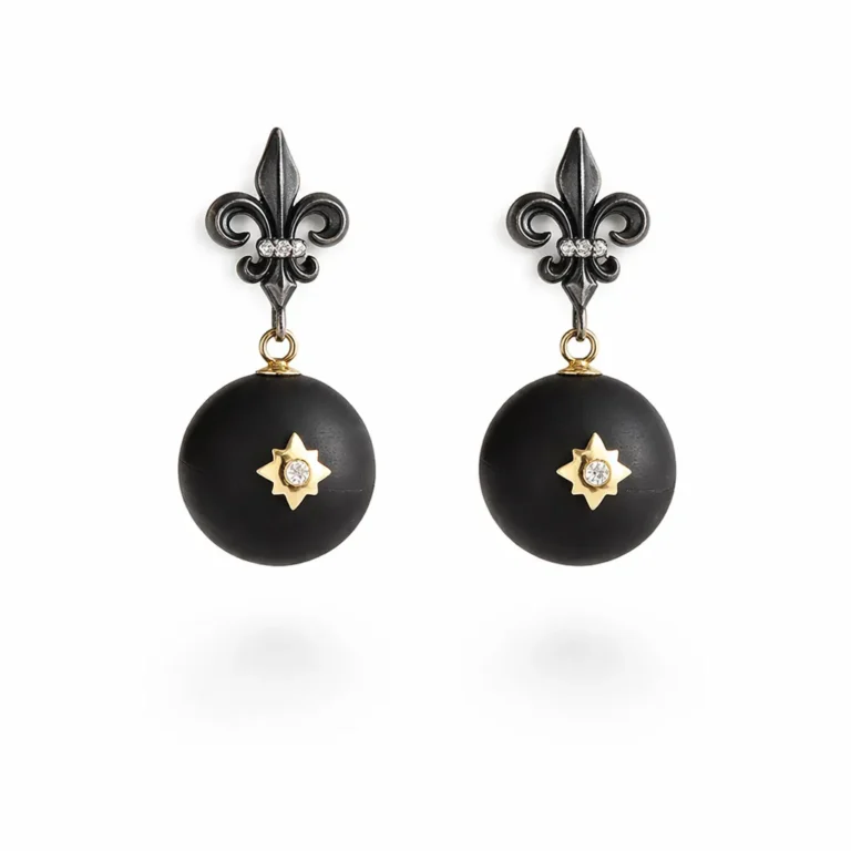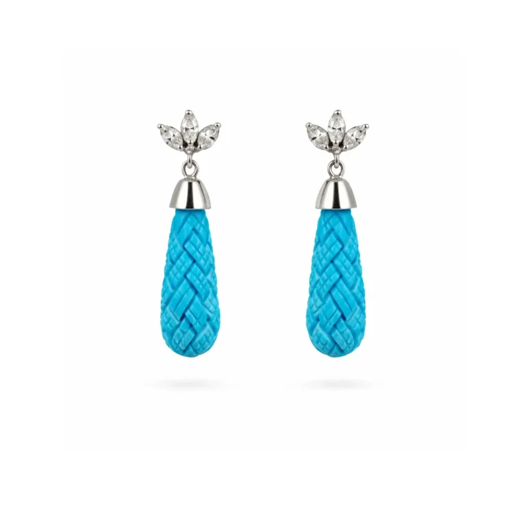 Turkuaz Taşlı Pırlanta Detaylı Fleur-de-Lis Motifli Küpe