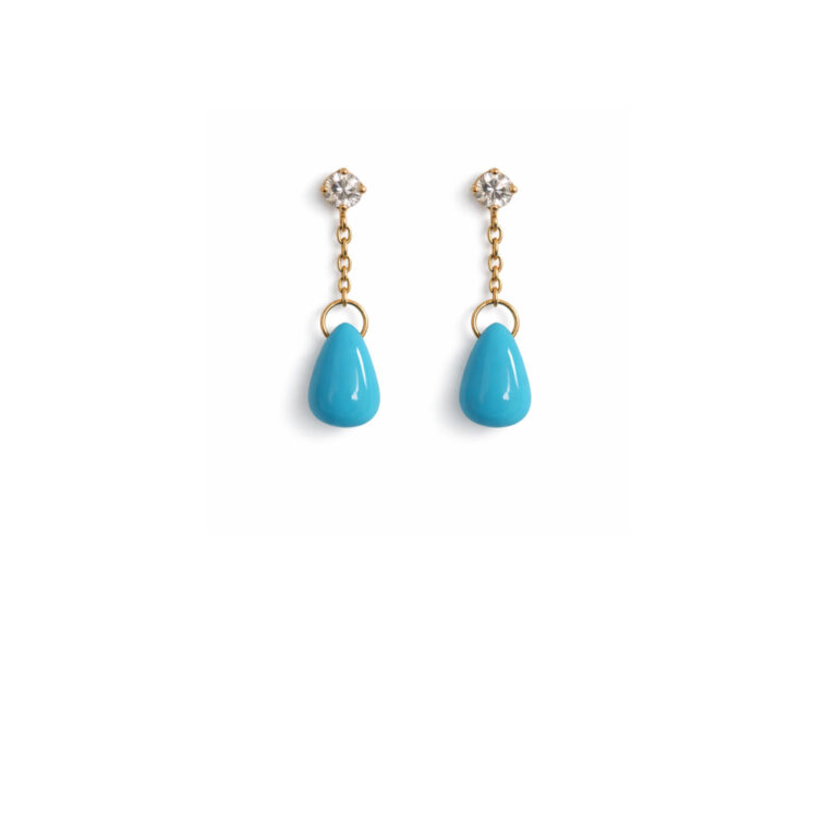 Turkuaz Taşlı Damla Form Pırlanta Detaylı Altın Küpe