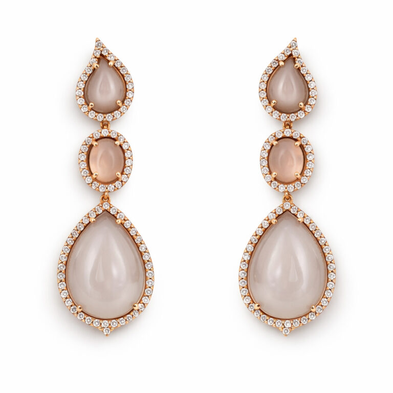 Moonstone Taşlı Çoklu Damla Form Pırlanta Detaylı Altın Küpe